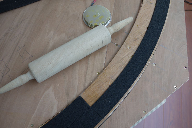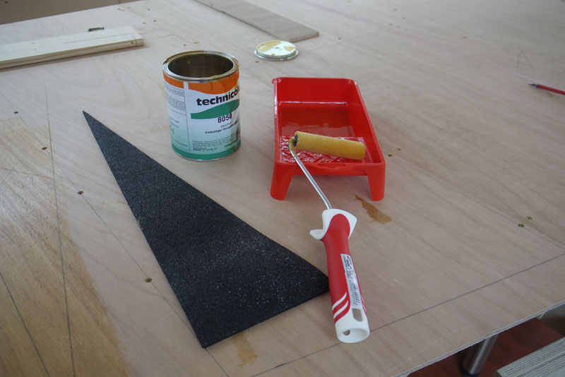 Zum Verkleben habe ich mir ein paar Dosen Technicoll 8050 im Internet besorgt, das ist ein speziell für Gummi geeigneter Kontaktkleber. Um nun Untergrund und Gummimatte mit dem Kontaktkleber zu beschichten, eignet sich nach meiner Erfahrung am besten eine Lackierolle mit einer samtartigen Beschichtung, Schaumstoff scheint nicht so geeignet zu sein. Die Rolle muss man anschließend wegwerfen, deshalb ist es sinnvoll, große Mengen von Gleisbettung in einem Aufwasch zu verlegen. Nach dem Ablüften, das weniger als fünf Minuten dauert, wird die Gummimatte auf den Untergrund gepresst. Ich benutze dafür ein Nudelholz, das ich meiner Frau entwendet habe.