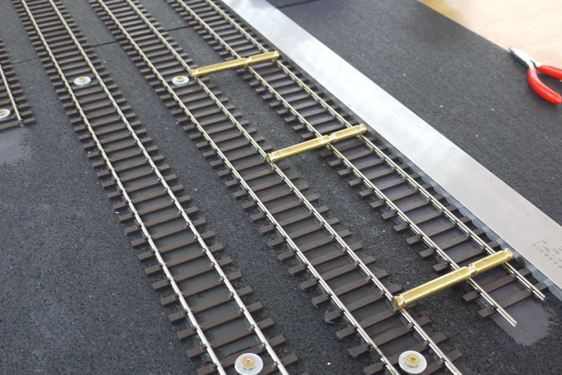 Im Abstellbahnhof habe ich die Gleise mit Hilfe meiner langen Stahlschiene, sowie selbst gedrehten Spurlehren und Abstandshaltern sauber verlegt: