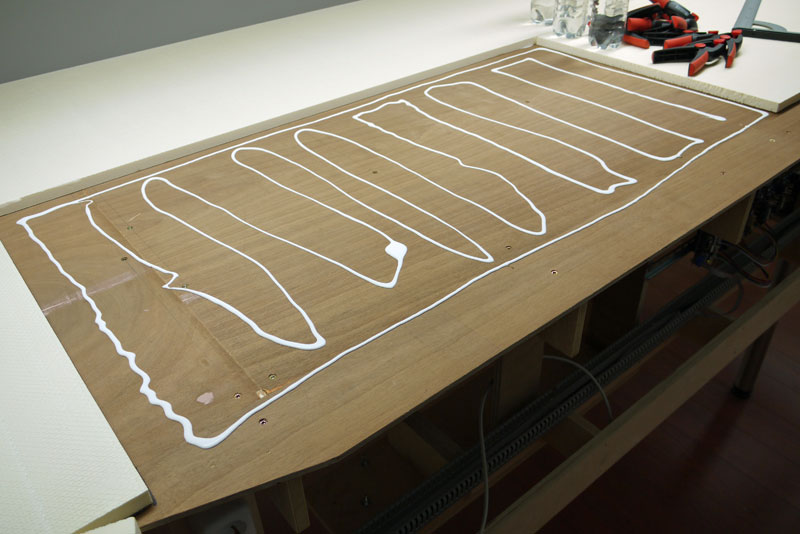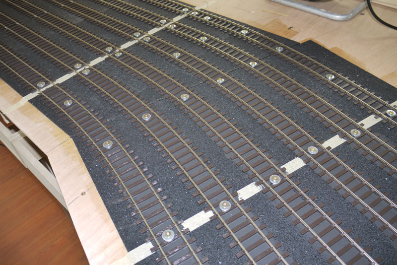 Bleibt dann nur noch, die Gleise auf der Gummimatte zu befestigen. Weil sich wegen der Geräuschdämmung nageln oder schrauben verbietet, bleibt nur kleben. Den guten alten Weißleim wollte ich nicht verwenden, weil der Gummi leicht porös ist und der Weißleim in die Löcher kriecht und dort verhärtet. Das sorgt für Schallbrücken. Im Netz werden verschiedene Kleber angeboten, die elastisch bleiben sollen, die mir aber zu teuer sind. Ich habe mich für Acryl aus der Kartusche entschieden. Aus offensichtlichen Gründen verwende ich schwarzes Acryl, das im Baumarkt leider teurer ist als die weiße Variante. Zum Kleben der Gleise drücke ich mit einer Kartuschenpistole eine Acrylraupe auf das Gleisbett und verstreiche sie dünn mit einem Spachtel (bei Gleisen, die man später nicht sieht, kann man sich das Verstreichen auch sparen). Die Breite ist dabei ziemlich egal. Dahinein drücke ich dann das Gleis. Das Acryl hat eine so gute Anfangshaftung, dass gerades Flexgleis nicht zusätzlich befestigt werden muss. In Bögen befestige ich die Gleise provisorisch mit Spaxschrauben und großen Unterlegscheiben. Über Nacht wird das Acryl fest und die Schrauben können entfernt werden. Acryl eignet sich übrigens auch gut zum Kleben von Hartschaum.