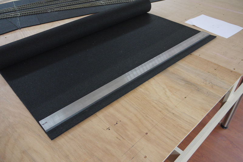Wenn ich die Gummimatte nicht flächig verlege, dann schneide ich sie in Streifen, die genau halb so breit sind wie der Gleisunterbau. Das geht mit einer schweren Stahlschiene und einem kräftigen Messer mit Abbrechklingen sehr gut.