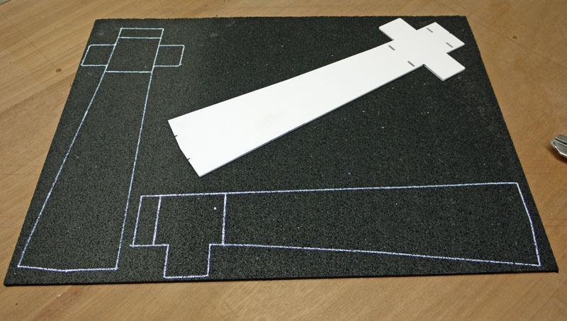 Mit der Schablone schneide ich die Gummiunterlage der Weiche aus und klebe diese mit UHU-Por auf die Hartschaumunterlage.