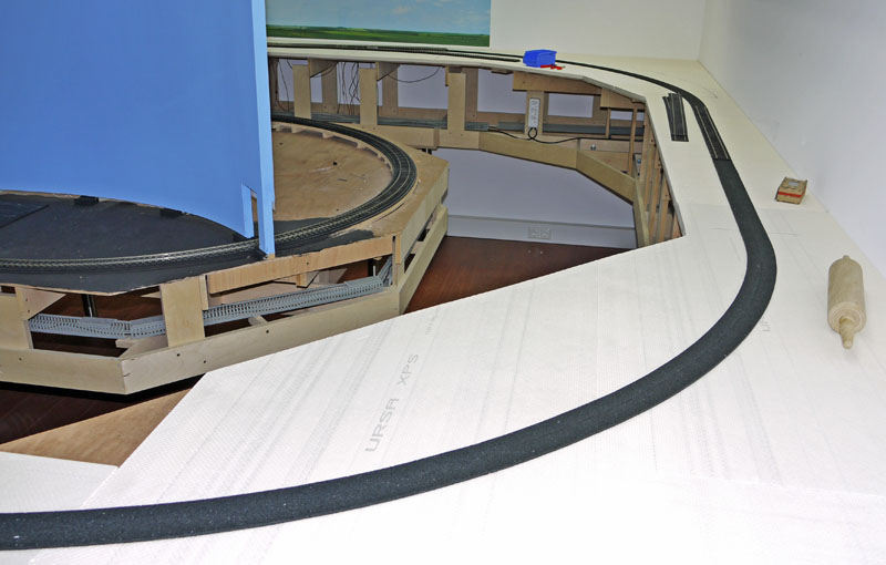 Zunächst habe ich die Fläche für den Bahnhof mit 20 mm Styrodur ausgelegt. Das Styrodur habe ich aus dem Bauhaus, es heißt URSA XPS, Plattengröße 1250 x 600 mm. Ein Paket mit 21 Platten kostet ca. 65 €, wenn ich mich richtig erinnere, bei 15,75 m² also etwas über 4 € pro m².
