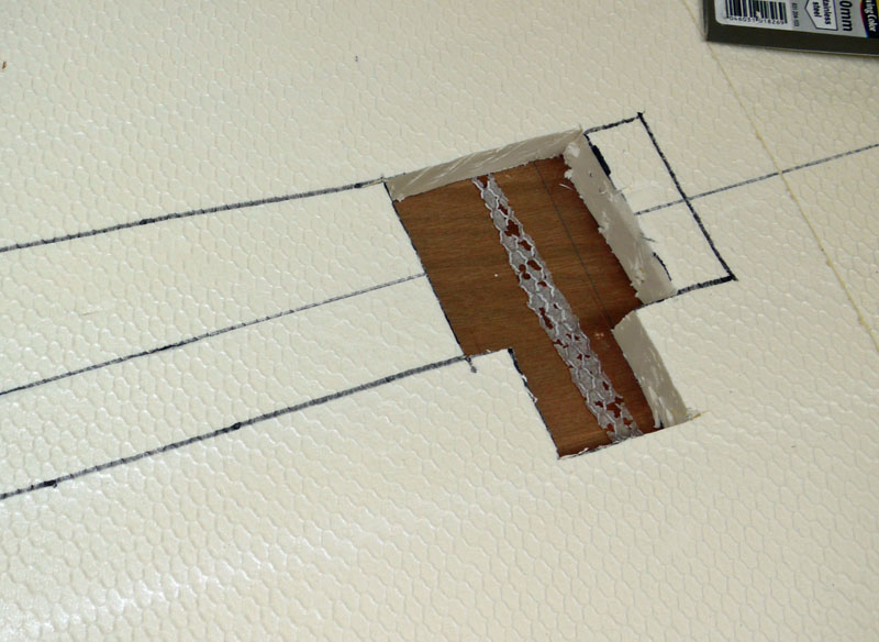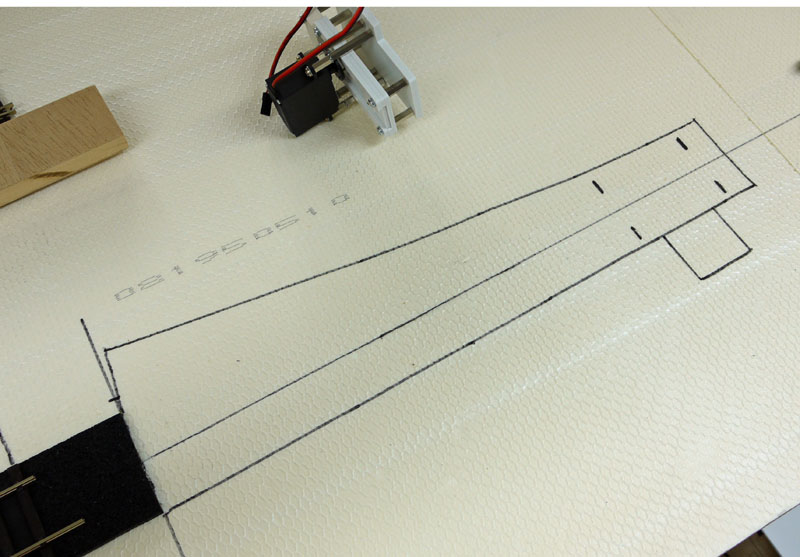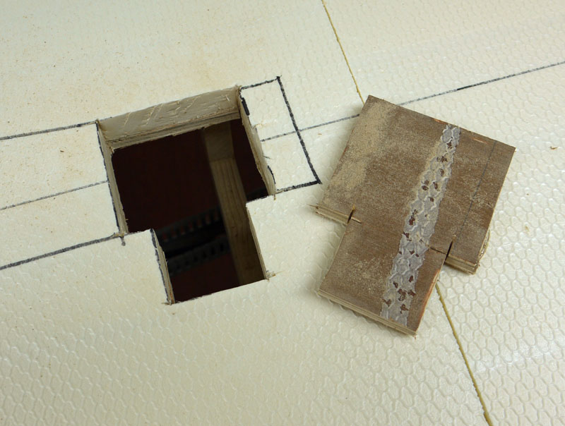 Weil ich die ganze Anlage mit 20 mm Hartschaum belegt habe, schneide ich danach den Umriß des Antriebs aus.