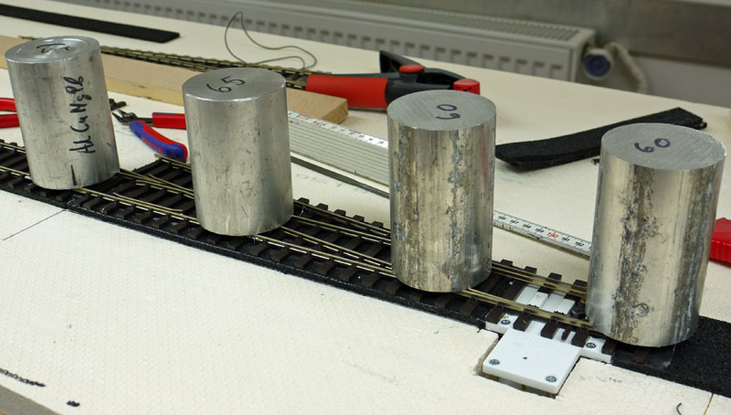 Zur Geräuschdämmung habe ich alle Gleise im Abstellbahnhof auf einer 5 mm starken Gummimatte aus Recyclinggummi verlegt. Die Streckengleise verlege ich auf einer doppelten Schicht, also 10 mm. Das mache ich, um die richtige Höhe des Schotterbetts zu erhalten. Das Material ist sehr schwer und entspricht meines Erachtens den Schalldämmstreifen, die von zwei oder drei Anbietern im Internet verkauft werden. Allerdings kostet das Material, das ich verwende, nur 7,99 € pro m² - ca. ein Drittel. Ich habe es bei der Firma www.rgs-shop.de in Rollen mit jeweils 10 m² gekauft. Es liegt 100 cm breit, die Rolle ist also 10 m lang und mörderisch schwer. Die Rohdichte beträgt 730 kg pro Kubikmeter. Eine Rolle hat 0,05 Kubikmeter, wiegt also 36,5 kg.