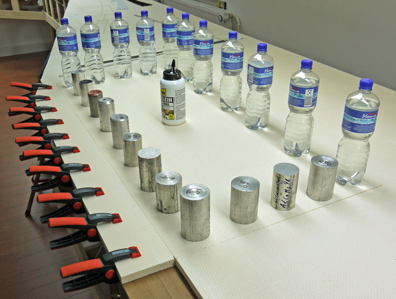 Darauf kommt dann eine dünne Schicht Acryl aus der Kartusche, mit dem Spachtel glattgezogen und schließlich die Weiche. Einige Alu-Abschnitte dienen zur Beschwerung bis das Acryl abgebunden hat.