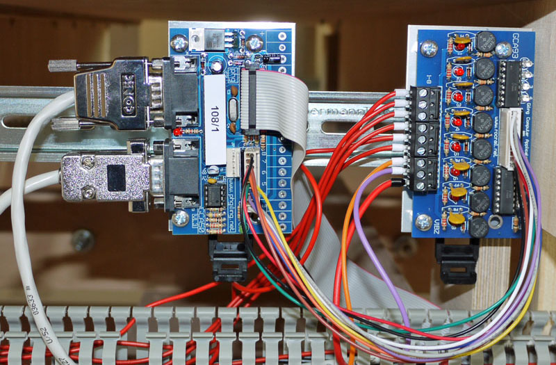 Die Ausgänge schalten Weichen mit Servoantrieb an den Servotreibern GCA136 oder meine fünf Peco-Weichen mit Magnetspulenantrieb im Abstellbahnhof über die Schnittstelle GCA76. Weitere Schaltvorgänge, die ohne dazwischengeschaltete Schnittstellenbausteine direkt ausgeführt werden, sind die Viesssmann Signale, die selbstgebauten Sperrsignale im Abstellbahnhof und die Schiebebühnensteuerung. Einige selbstenetwickelte Schnittstellenbausteine sind für die Herzstückplarisierung der Peco-Weichen im Abstellbahnhof und die Gleisstromversorgung im Abstellbahnhof, abhängig von der Position der Schiebebühne.