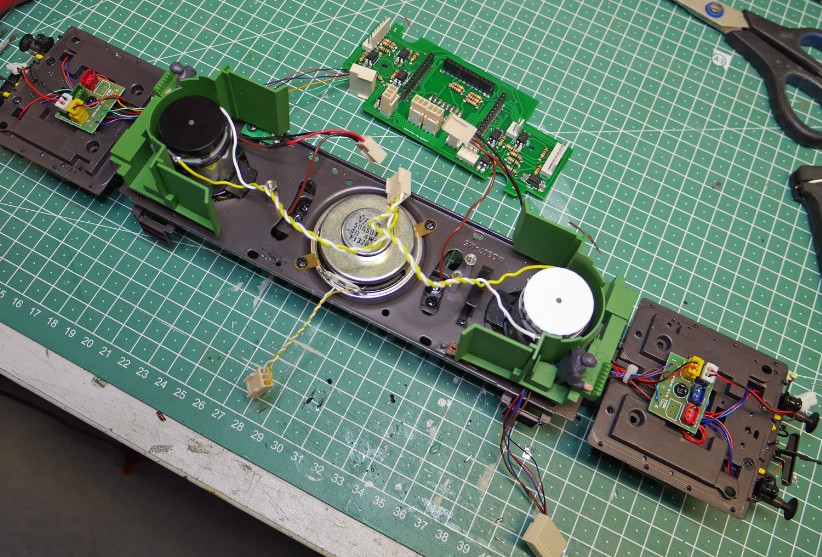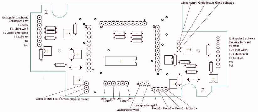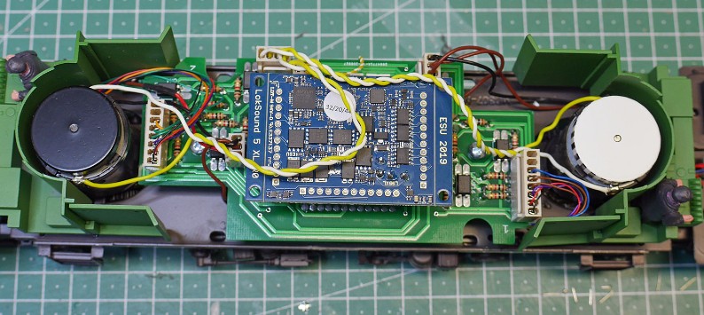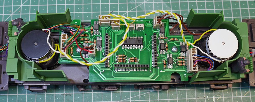 So etwas kann man natürlich nicht fliegend verdrahten, deshalb habe ich eine Platine entworfen, auf die der Decoder (ein ESU Loksound 5.0 XL) aufgesteckt wird. Die Platinen lasse ich professionell in China produzieren.