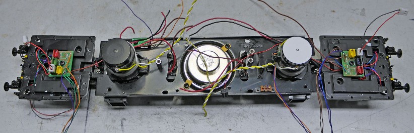 Von den Platinen auf den Vorbauten kommen insgesamt sechs dünne, farbige Drähte. Der schwarze und der rote führen zur elektrischen Kupplung. Der violette ist der Minuspol (GND). Der orange und der blaue führen jeweils zu den roten LED der Beleuchtung. Intelligenterweise verwendet MTH für das weiße Licht und für die Führerstandsbeleuchtung dieselben Farben, nämlich jeweils braun und grün. Das einfachste ist, beides auf gut Glück anzuschließen und später ggf. zu vertauschen.