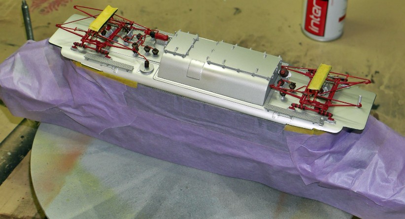 Zunächst wird die Lok geöffnet. Dazu kann Sie mit dem Dach auf ein Stück Styrodur gelegt werden, so dass die Pantografen frei sind und nicht belastet werden. An beiden Vorbauten werden von unten 4 Schrauben entfernt, dabei den Vorbau festhalten. Mit der Lok sind die Vorbauten jeweil mit zwei Kabeln verbunden, den zugehörigen Stecker abziehen. Weil die Vorbauten nicht gleich sind, empfiehlt es sich, den Vorbau an Führerstand 1 zu markieren.