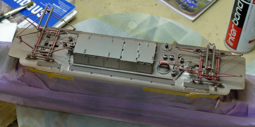 Ich habe rigoros die originale Elektrik entfernt, nur die Pantografenantriebe im Gehäuse und die Anschlussplatinen der Beleuchtung auf den Vorbauten habe ich weiterverwendet. Auf dem Bild nicht zu sehen, aber hier sitzt auch das größte Problem bei einem Decodertausch. MTH verwendet nicht einen gemeinsamen Pluspol für die zweifarbige Beleuchtung, sondern einen gemeinsamen Minuspol. Weil aber die Ausgänge eines ESU-Decoders nach Minus schalten (und auch alle anderen Decoder, die ich kenne) funktioniert das nicht. Das gleiche Problem hatte ich auch beim Umbau meiner BR44 und meines Taurus. Also musste eine Schaltung her, die die Verhältnisse umkehrt - das Auswechseln der rot/weißen LED ist nämlich die Hölle. Ich habe dafür Optokoppler verwendet, bei denen die Anode der LED über einen Vorwiderstand 1K an U+ des Decoders angeschlossen sind. Die Kathoden der LED sind mit den Ausgängen des Decoders verbunden. Schaltet nun ein Ausgang, leuchtet die LED auf (kann man natürlich nicht sehen, weil im Gehäuse des Optokopplers). Der Phototransistor im Optokoppler wird dadurch leitend und der Strom fließt von U+ über den Kollektor des Transistors zum Emitter und von da über einen Vorwiderstand von 1K zur Anode der LED in der Lampe und von der Kathode der LED zum GND-Anschluss des Decoders. Alles klar? Damit sind die Verhältnisse umgekehrt und die Beleuchtung funktioniert. Bevor mir die Elektroniker schreiben: man kann statt der Optos natürlich auch PNP-Transistoren verwenden, die sind mir aber unsymphatisch und die Verhältnisse mit Optokopplern sind für mich klarer.