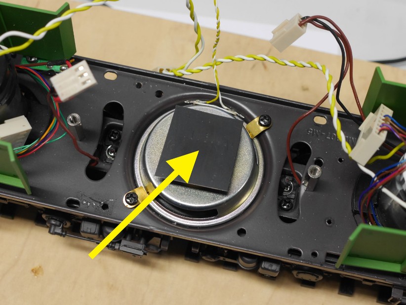Die Motorleitungen sind leicht zu finden. Die gelbe Leitung gehört an Motor- und die weiße an Motor+. Der Motor mit den Zebrastreifen auf der Schwungmasse ist der vordere Motor (Führerstand 1).