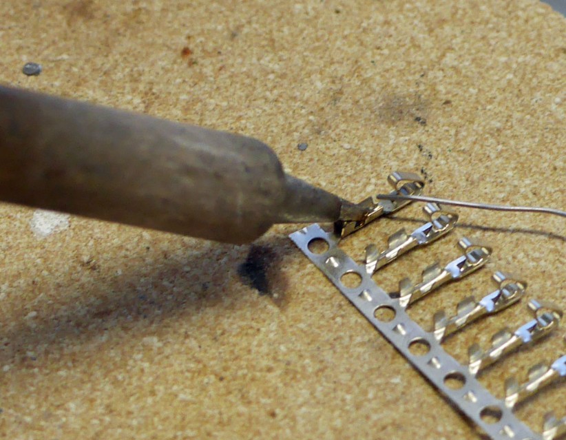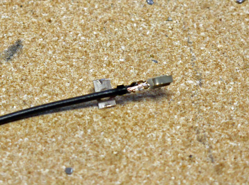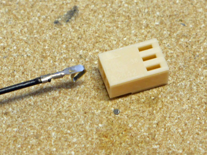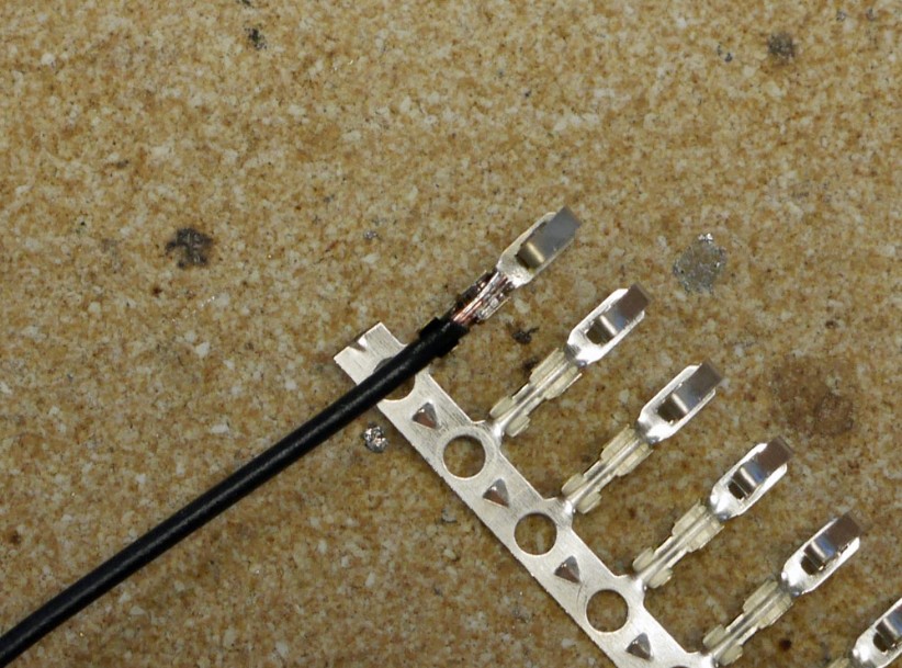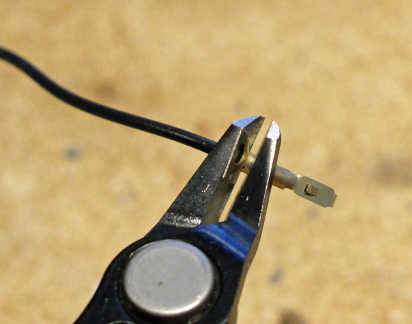 Der fertige Kontakt im Gehäuse. Möchte man ihn wieder herausziehen, muss die Rastnase mit einem spitzen Gegenstand zurückgedrückt werden.