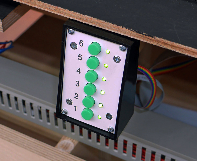 Weil mit der Schiebebühnen-Steuerung auch die Weichenstraße zum Abstellbahnhof geschaltet wird, befindet sich ein zweites Bedienteil am Anfang des Abstellbahnhofs um unnötige Lauferei zu vermeiden.
