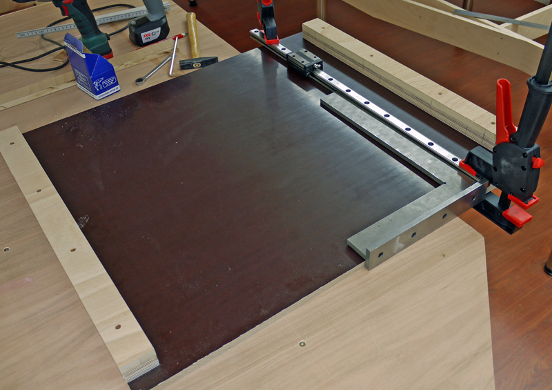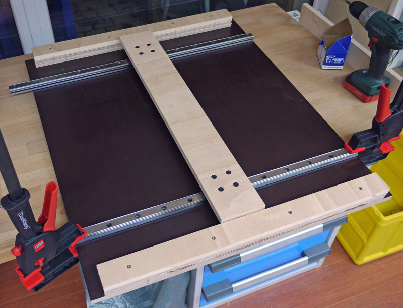 Gedacht - getan. Als erstes habe ich mir im Baumarkt eine passendes Stück Siebdruckplatte besorgt. Siebdruckplatte ist zwar teuer, wirft sich aber nicht und ist sehr formstabil. Auf diese habe ich dann links und rechts zwei Streifen Tischlerplatte geschraubt und dann Laufschienen mit Kugelführungen befestigt, die mir mal ein Schrotthändler geschenkt hat.