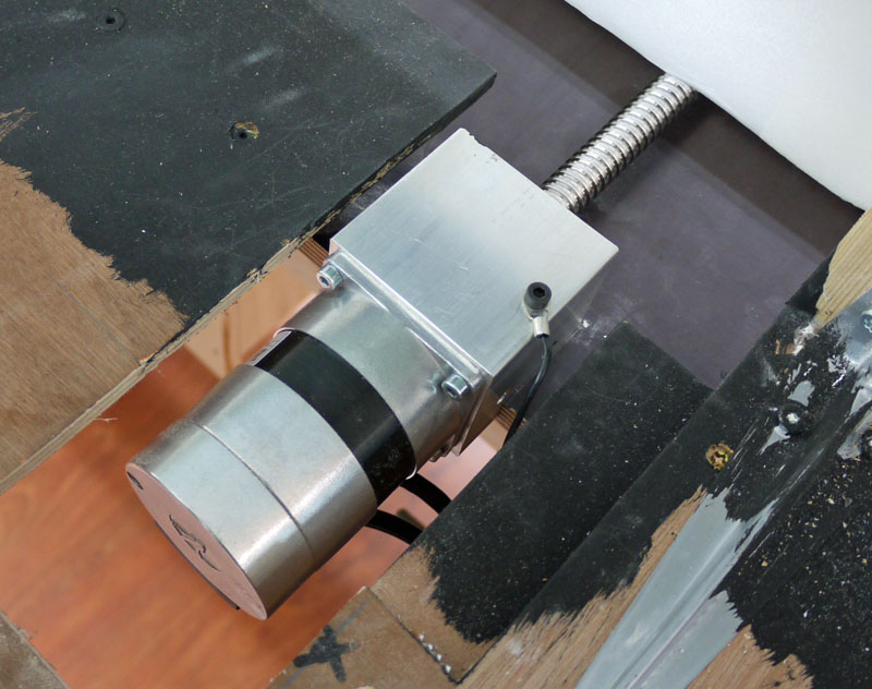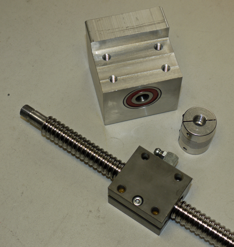 Mittig unter der Platte für das Gleis habe ich eine Kugelgewindemutter befestigt, in die ich vorher eine passend bearbeitete Kugelgewindespindel eingedreht hatte. Kugelgewindespindeln mit Muttern sind Bauteile, die Drehbewegungen sehr präzise in Linearbewegungen umwandeln. Das lineare Spiel zwischen Spindel und Mutter ist dabei geringer als drei Hundertstel Millimeter. Das Teil, das wie eine Feder aussieht, ist eine elastische Wellenkupplung, die den Motor an die Spindel koppelt und dabei kleine Ungenauigkeiten ausgleicht. Die Kupplung befindet sich dabei in dem großen Alublock, in dem die Spindel in dem vorn sichtbaren doppelreihigen Schrägkugellager gelagert wird und der am anderen Ende den Motor aufnimmt.