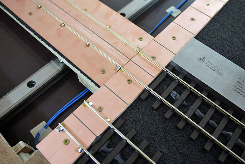Hier sieht man, wie ich die Schienen der abgehenden Gleise auf die Seitenstreifen gelötet habe.