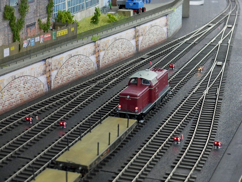Die Abstellgruppe, die Weichenstraße und die Schiebebühne werden vom Computer gesteuert und abgesichert. So wird jedes der 6 Abstellgleise nur dann mit Strom versorgt, wenn die Schiebebühne auf diesem Gleis steht. Um die Lenzsche USP zu überlisten, werden die anderen Gleise auch noch kurzgeschlossen. Damit ist sichergestellt, dass ein Zug oder eine Lok nicht in die Grube der Schiebebühne fahren kann (ich habe Enkel von 6 und 8 Jahren). Weiterhin werden bei der Anwahl eines Gleises mit der Schiebebühnensteuerung auch die Weichen entsprechend gestellt. Alles das habe ich mit Rocrail und XML-Scripten programmiert.