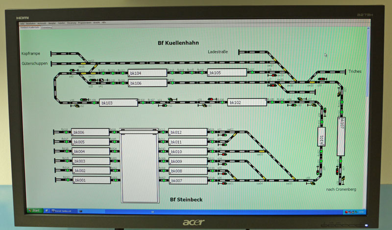 Ist alles korrekt eingerichtet, kann man mit der Maus auf dem Monitor die Weichen und Signale stellen. Das klingt zunächst bequem, ist es aber leider nicht. Das größte Problem ist die Unterbringung und Ansteuerung der Monitore. Ich habe zunächst über dem Bahnhof Küllenhahn und an der Wand hinter dem Bahnhof Cronenberg je einen 24 Zoll Monitor angebracht. Das Ergebnis war, dass ich beim Monitor in Küllenhahn die Genickstarre bekomme, weil er zu hoch hängt, der Monitor hinter Cronenberg ist zu weit weg - sehr schwer, darauf etwas zu erkennen.