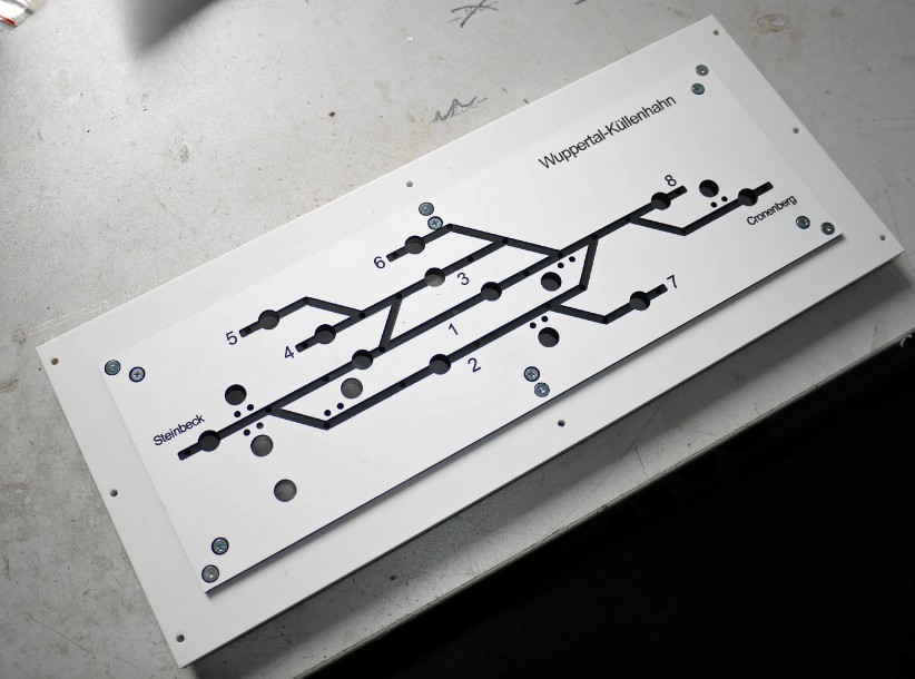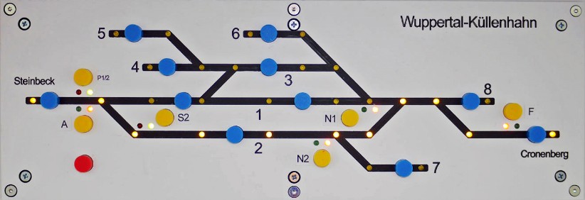 Im folgenden Foto ist das Stellpult für den Bahnhof Küllenhahn zu sehen, die blauen Knöpfe sind für die Fahrstraßen, die gelben für die Signale und der rote Knopf löscht die eingestellten Fahrstraßen wieder, so dass eine neue Fahrstraße eingestellt werden kann. Im Foto ist eine Durchfahrt von Cronenberg nach Steinbeck eingestellt, das Zwischensignal S2 steht auf HP 2 und das Ausfahrsignal P1/2 steht auf HP1.